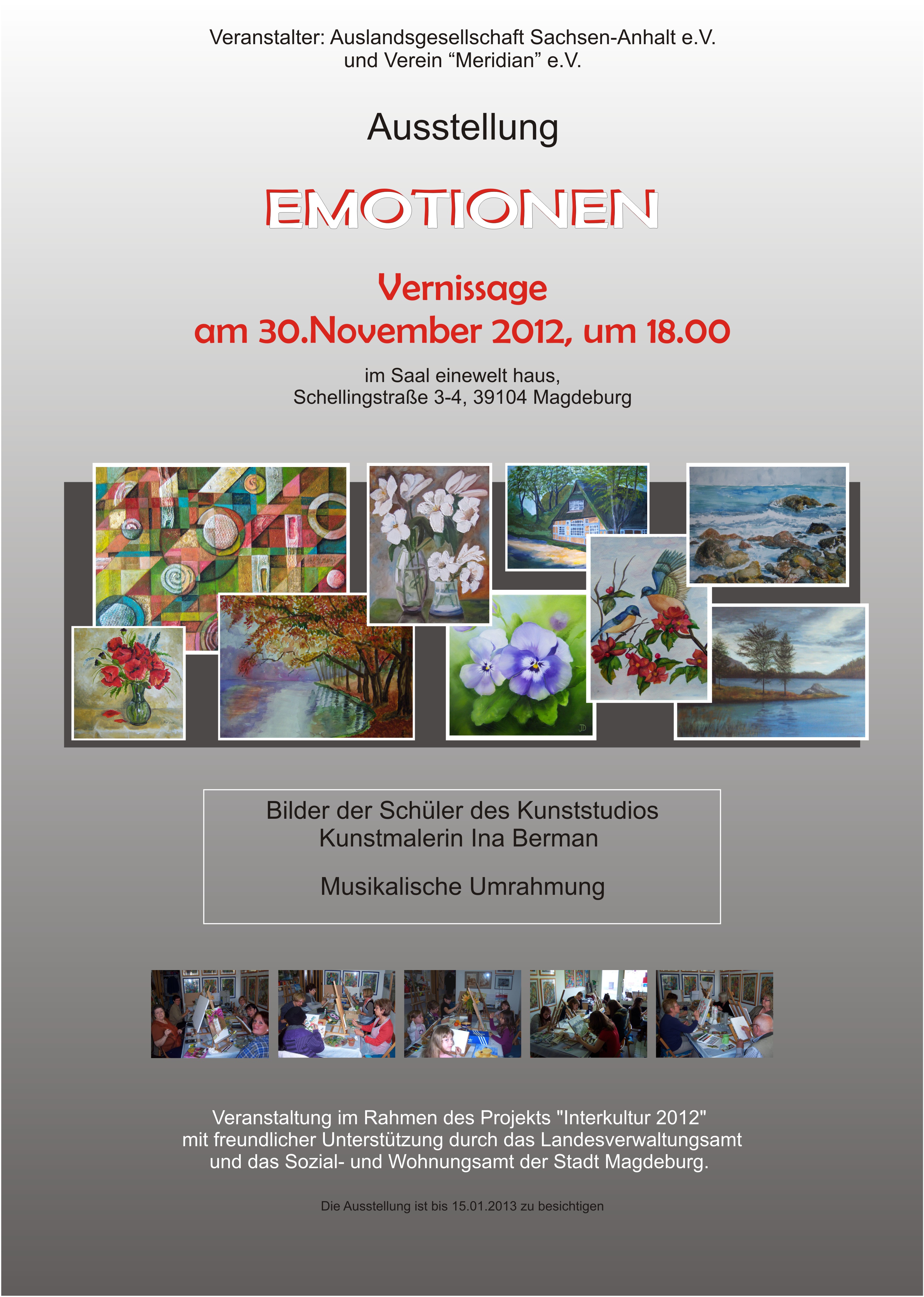 Diagnose: 40° Kunst - unter diesem Motto lädt der Kunstverein Kunstrefugium e.V. zu einer Dauerausstellung in den Räumlichkeiten des Facharztzentrums im Einstein. Lassen auch Sie sich infizieren vom Kunstfieber und besuchen Sie unsere Vernissage am 04.03.2011 um 18.00 Uhr in der EinsteinstraÃe 130, 81675 München. Mit groÃer Bandbreite präsentieren sich etliche Vereinsmitglieder in den unterschiedlichsten Stilrichtungen der bildend...en Kunst und eine Vielzahl von ihnen wird am Tage der Vernissage anwesend sein, um sich gerne im persönlichen Kontakt mit den Besuchern über ihr Tun zu unterhalten. Unter der Moderation des Schöngeistes Prof. Dr. Steike und bei kulinarischen Köstlichkeiten wird ein Abend in familiärem Ambiente stattfinden, der gewiss für Kurzweil sorgt. Ferner werden in der Lounge einige Künstler bei live der Arbeit zu sehen sein! Aufgrund versandter Einladungen haben sich bereits einige honorige Personen aus Kunst, Kultur, Politik und Gesellschaft angekündigt. Soviel sei gesagt: Es wird ein interessanter Abend. Auch Zusagen von Pressevertretern liegen schon vor.